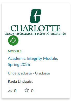 Student Accountability & Conflict Resolution developed an academic integrity Canvas module that can be easily added to a Canvas course. The purpose of the module is to enhance student’s understanding of academic integrity from a holistic viewpoint and to increase their awareness of UNC Charlotte’s expectations related to integrity in the academic setting. Students will review a series of slides and complete a short multiple-choice quiz.